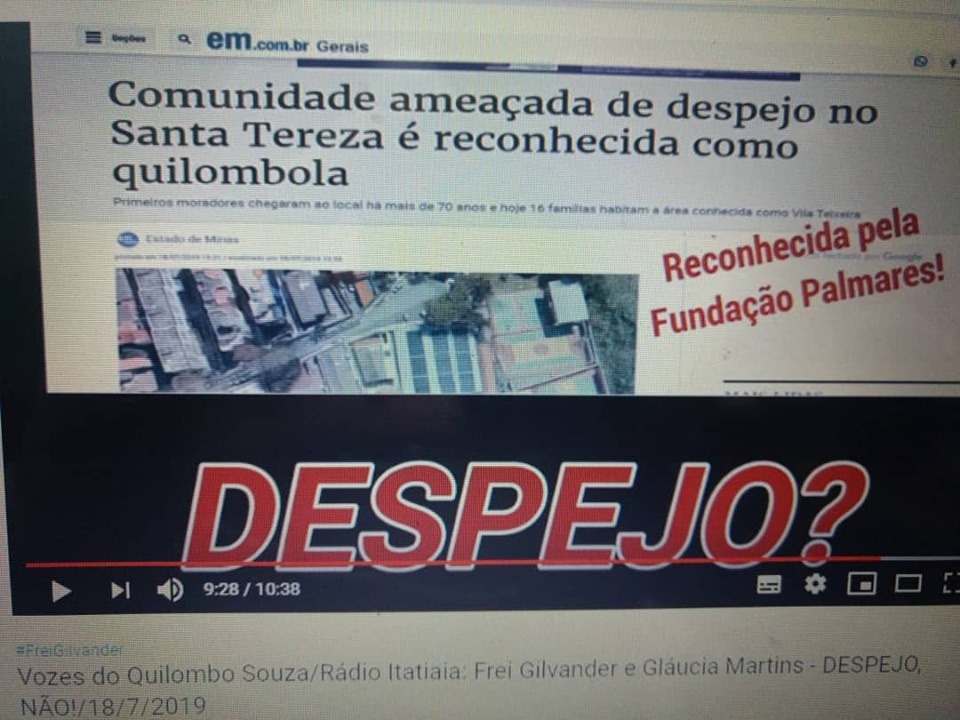 Vozes do Quilombo Souza, na Vila Teixeira, em Belo Horizonte, MG. Rádio Itatiaia: Frei Gilvander e Gláucia. DESPEJO, NÃO! – 18/7/2019.