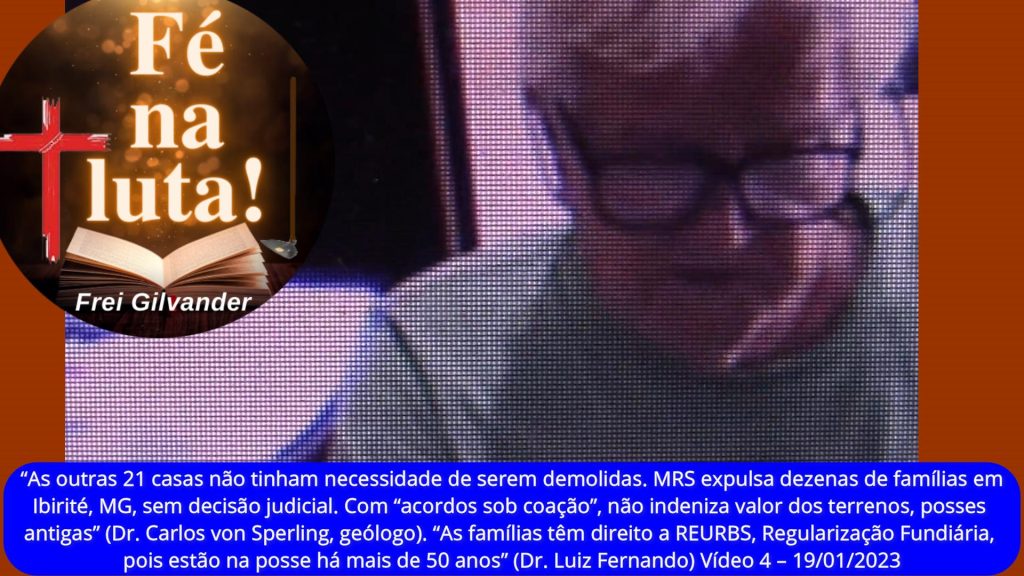“As outras 21 casas não tinham necessidade de serem demolidas. MRS expulsa dezenas de famílias em Ibirité, sem decisão judicial. Com “acordos sob coação”, não indeniza valor dos terrenos, posses antigas” (Dr. Carlos von Sperling, geólogo). “As famílias têm direito a REURBS, Regularização Fundiária, pois estão na posse há mais de 50 anos” (Dr. Luiz Fernando) Vídeo 4 – 19/01/23