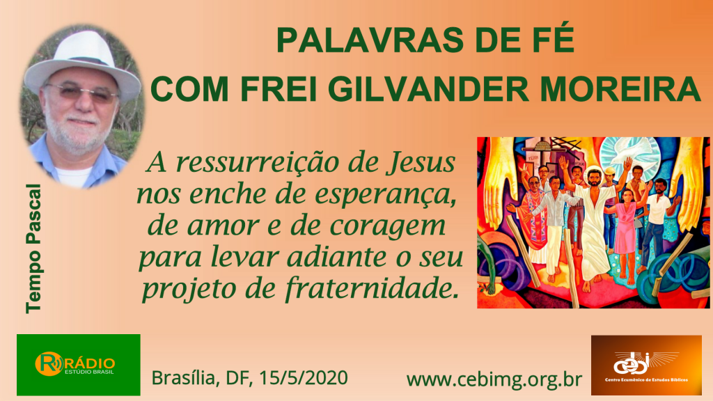 A ressurreição de Jesus nos enche de esperança, de amor e de coragem para levar adiante o seu projeto de fraternidade. “Palavras de Fé, com frei Gilvander Moreira” – Rádio Estúdio Brasil, Brasília, DF, 15/5/2020