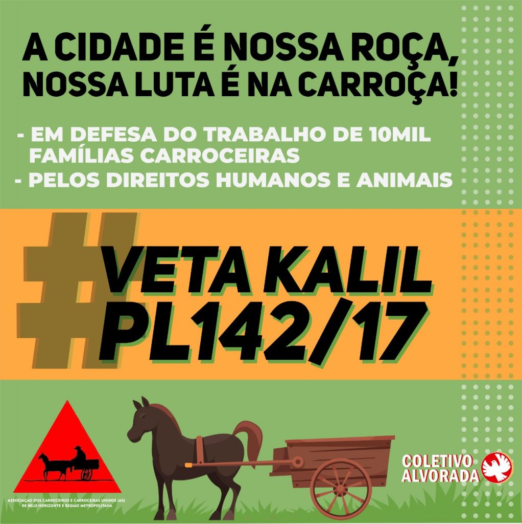 Diante do exposto, solicitamos ao Prefeito Alexandre Kalil o veto total ao PL 142/17 e a abertura de espaços e instâncias de diálogo com os carroceiros e carroceiras para a consolidação e construção de políticas públicas que garantam os direitos humanos e animais, para cuidar dos milhares de famílias carroceiras e dos seus animais. Isso é o justo e por isso lutamos.