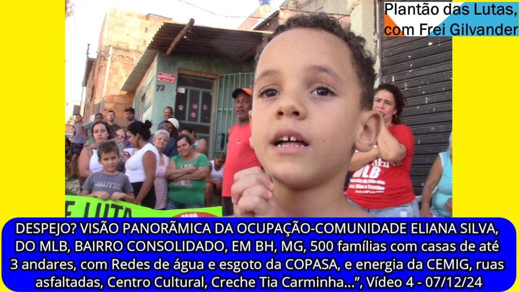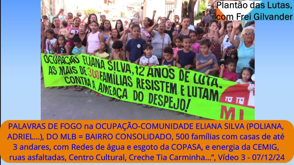 2 – “ABSURDO TENTAR DESPEJAR A OCUPAÇÃO-COMUNIDADE ELIANA SILVA, DO MLB = BAIRRO CONSOLIDADO, 500 famílias com casas de até 3 andares, com Redes de água e esgoto da COPASA, e energia da CEMIG, ruas asfaltadas, Centro Cultural, Creche Tia Carminha…”, Vídeo 2 – 07/12/24