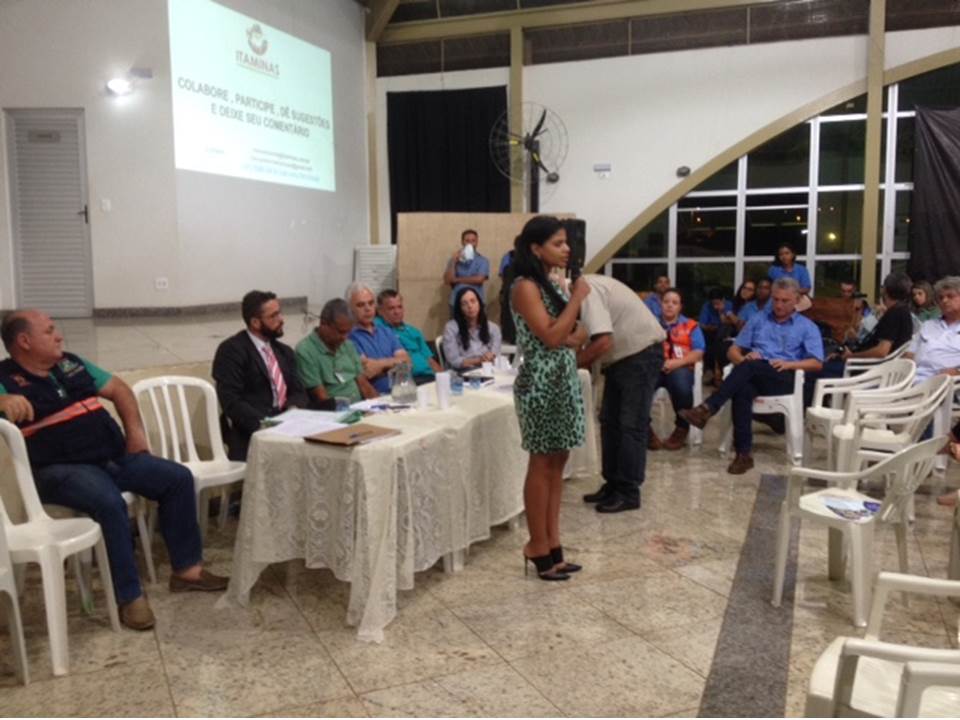 A Audiência iniciou-se com uma pequena fala de todos da mesa. Destaca-se que a Promotora de Justiça Isabela Carvalho informou, de antemão, que já teria sido instaurado um inquérito visando apurar a real situação da mineração Itaminas em Sarzedo. Primeiramente, os representantes da mineração Itaminas fizeram uma apresentação dos projetos futuros e testes relacionados à drenagem de barragens e dos programas relacionados à segurança da população e planos de comunicação de risco.