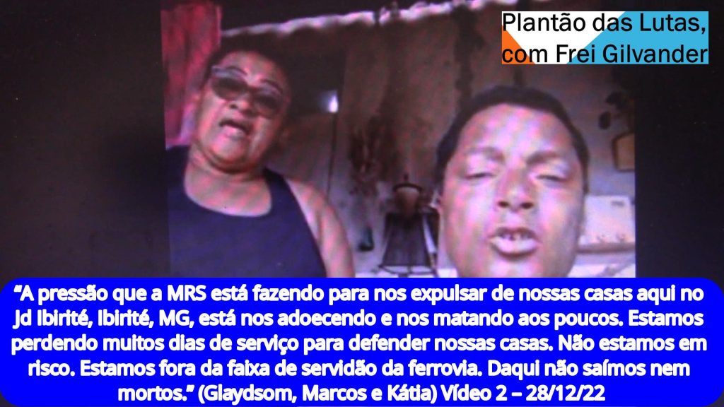 “A pressão que a MRS está fazendo para nos expulsar de nossas casas aqui no Jd Ibirité, Ibirité, MG, está nos adoecendo e nos matando aos poucos. Estamos perdendo muitos dias de serviço para defender nossas casas. Não estamos em risco. Estamos fora da faixa de servidão da ferrovia. Daqui não saímos nem mortos.” (Glaydsom, Marcos e Kátia) Vídeo 2 – 28/12/22