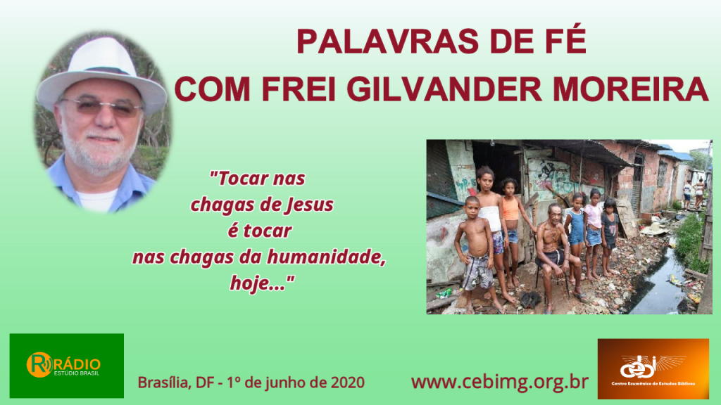 “Tocar as chagas de Jesus é tocar nas chagas da humanidade, hoje, e ser capaz de reconhecer a presença do Espírito nas vítimas da sociedade atual. E são tantas pessoas…” – Palavras de Fé, com frei Gilvander Moreira – Rádio Estúdio Brasil – Brasília – DF, 1º de junho de 2020.