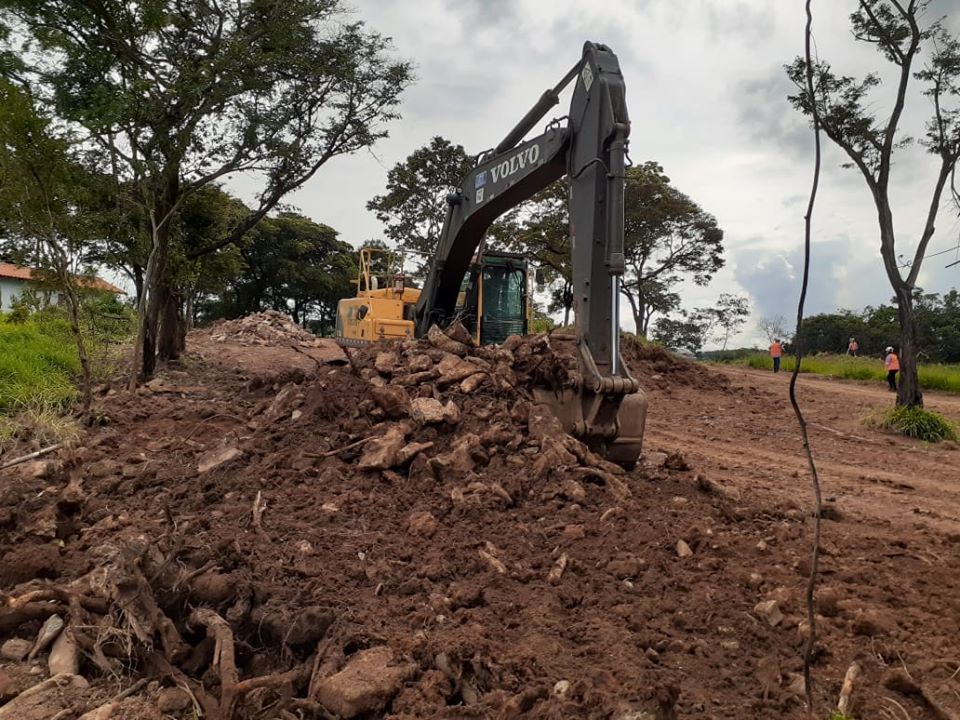 Retroescavadeira a serviço da mineradora Vale recolhendo os escombros – pedras do Muro de Pedra do sítio Histórico e Arqueológico Ponte das Almorreimas -, no município de Brumadinho, MG. Ao fundo a antiga igrejinha de São Vicente de Paulo. A Vale demoliu mais de 300 metros de um Muro de Pedras da época da escravidão, que a Comunidade de Ponte das Almorreimas preservava com carinho. No sítio, arqueóloga e moradores encontram vestígios arqueológicos. Eis mais um crime que está sendo perpetrado pela mineradora Vale. De fato, “de espinheiro só pode vir espinhos”. Foto: Cléria Nogueira. 02/01/2020.